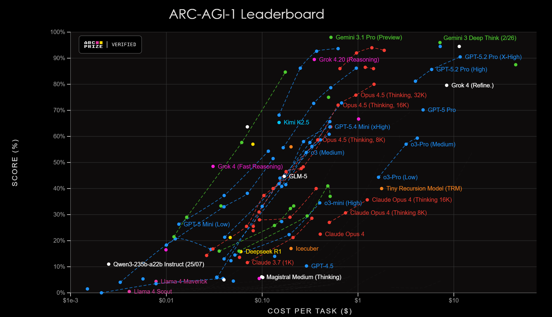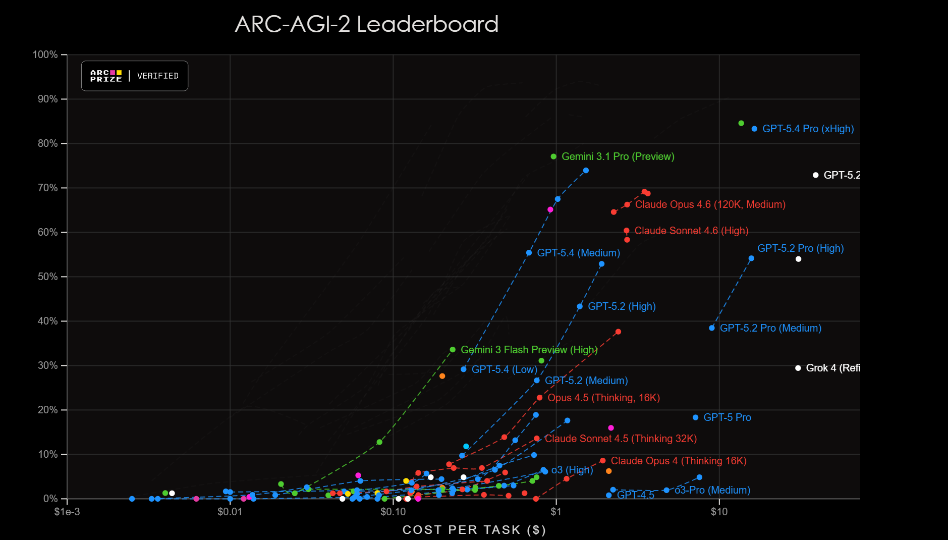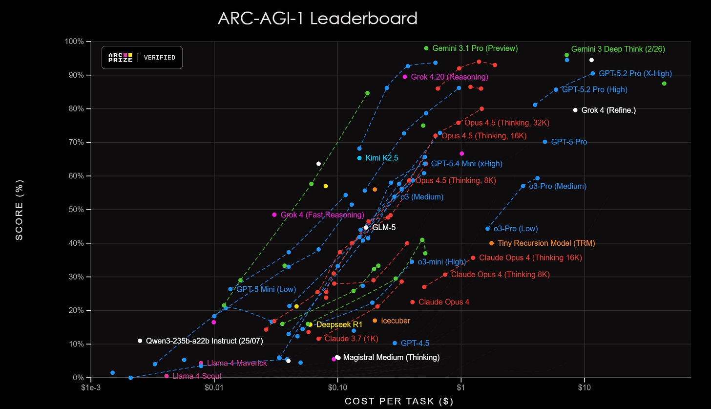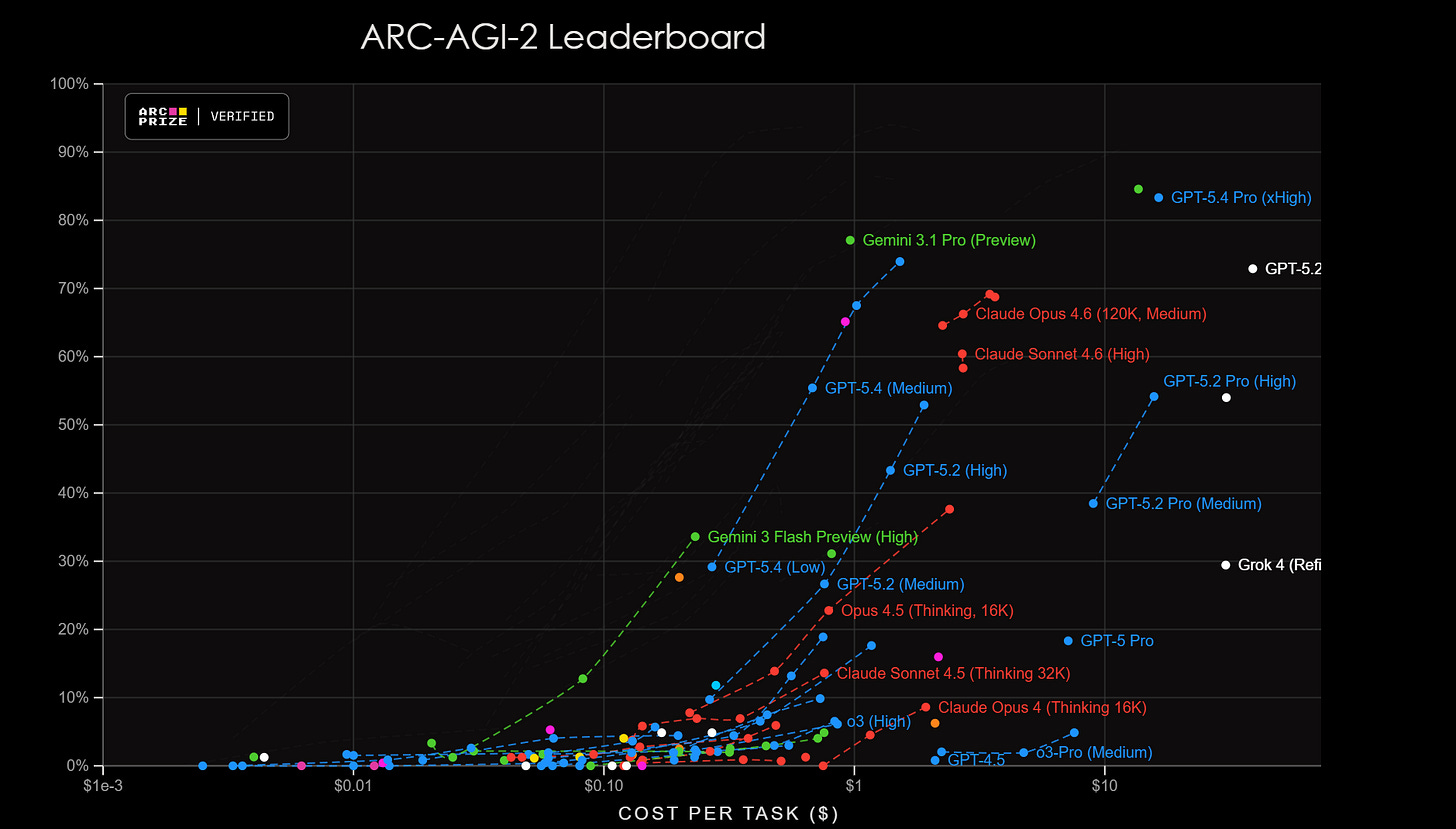 The ARC-AGI-2 leaderboard proved to be somewhat tougher. No model has yet scored a 90% on this test, but the latest OpenAI and Google models are closing in.
